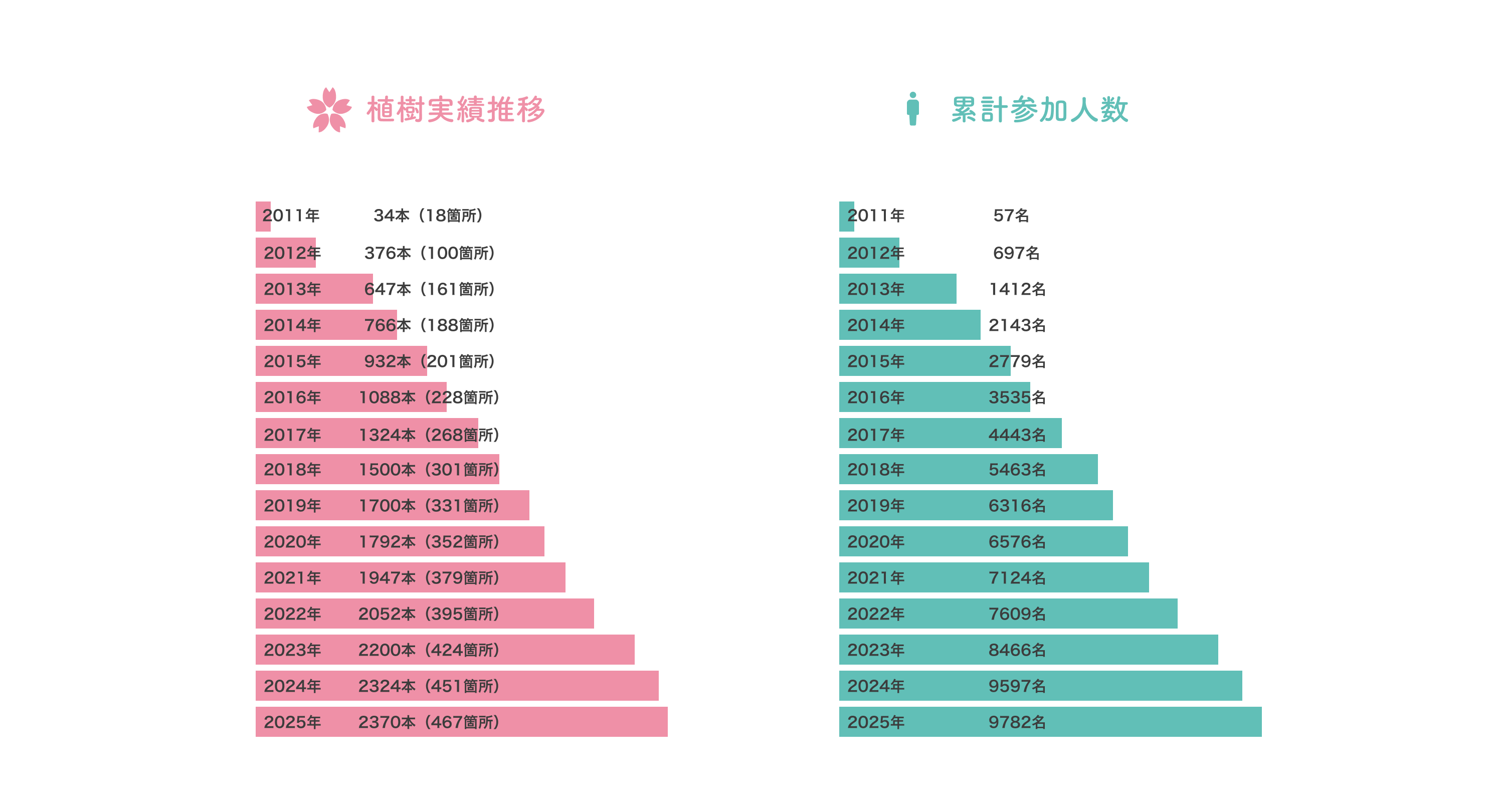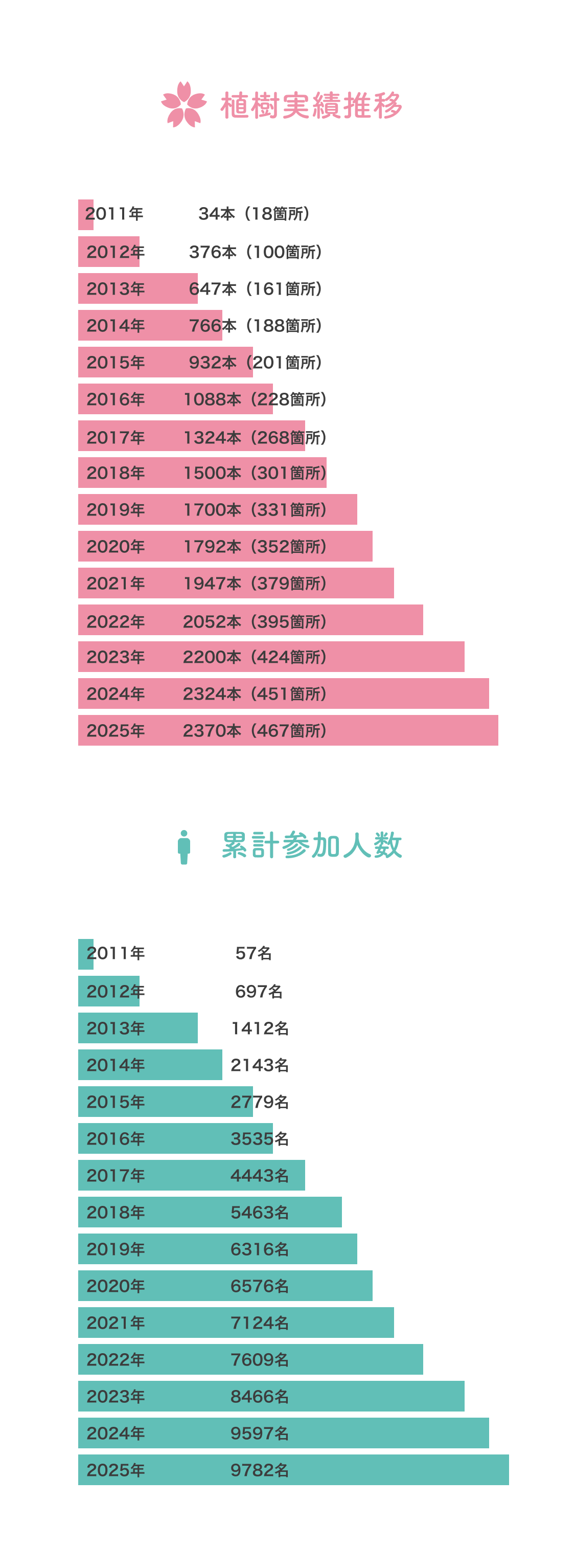 ●2025年3月末時点で2,370本の桜を植樹(目標達成率:約14%)